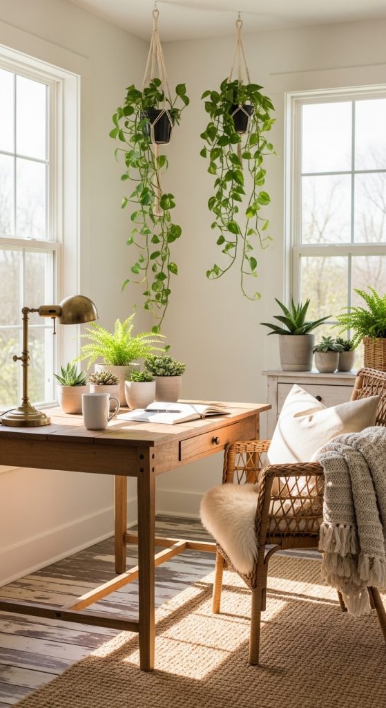 Integrating plants and natural textures is essential for farmhouse decor. Small potted plants, hanging greenery, or a vase with fresh flowers bring life and color to your office. Incorporate natural fiber rugs, wicker chairs, or wooden trays to emphasize texture and warmth.