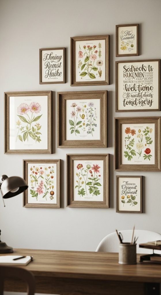 Walls are the perfect canvas for farmhouse inspiration. Consider vintage prints, botanical illustrations, or typography signs with encouraging quotes. Wooden frames or distressed finishes complement your rustic desk and shelving. A gallery wall behind your workspace can make the room feel curated and personalized.