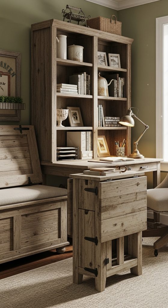Farmhouse offices often balance style with practicality. Choose furniture that serves multiple purposes, like a bench with storage, a foldable table, or a bookcase that doubles as a room divider. This approach maximizes space without sacrificing the rustic, cozy aesthetic.