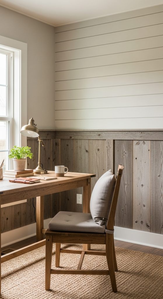 A simple accent wall can dramatically elevate your farmhouse office. Shiplap, reclaimed wood panels, or even textured wallpaper creates depth and visual interest. Paint it in soft neutrals, like creamy whites, muted grays, or sage greens, to keep the space calming.
