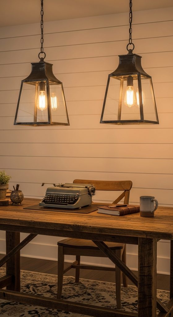 Lighting transforms any office space, and farmhouse decor thrives on warm, inviting illumination. Choose statement pendant lights in aged metal, lantern-inspired fixtures, or chandelier-style lamps with rustic finishes. Desk lamps with soft, adjustable lighting reduce strain while creating a cozy atmosphere.