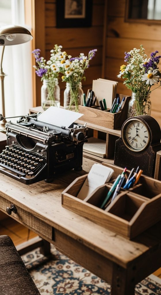 Farmhouse decor is all about character, and vintage pieces fit perfectly. Look for old typewriters, antique clocks, mason jars, or wooden organizers to decorate your desk. Even repurposed items, like crates as filing storage, add charm. These pieces blend functionality with aesthetics, giving your office personality.