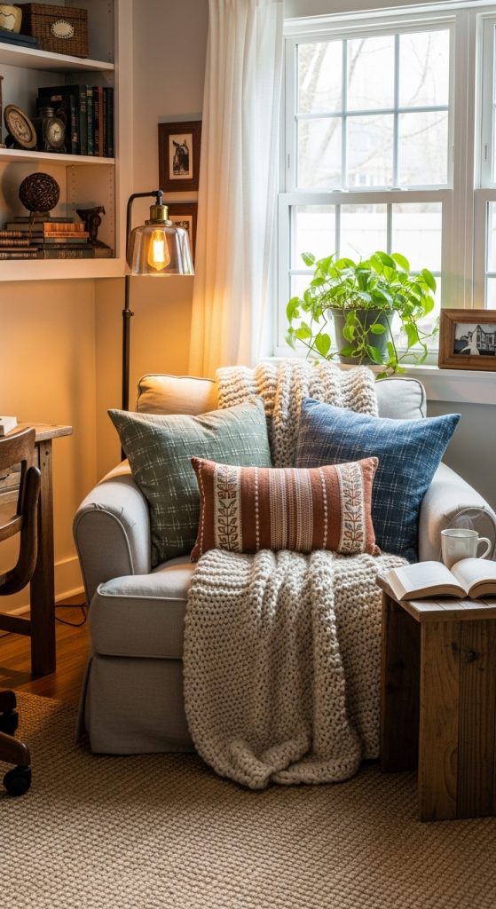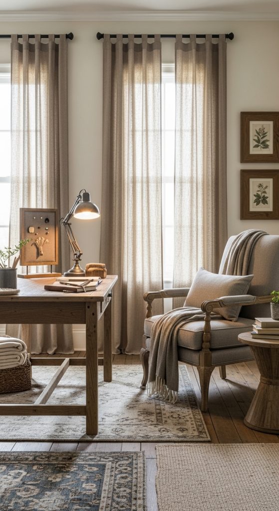 Every home office benefits from a cozy corner for reading or brainstorming. A soft, oversized armchair with a knitted throw and a patterned cushion instantly makes a space inviting. Consider a small side table in distressed wood to hold your coffee or favorite books. Adding a floor lamp with a warm-toned bulb enhances the farmhouse ambiance while providing functional light.