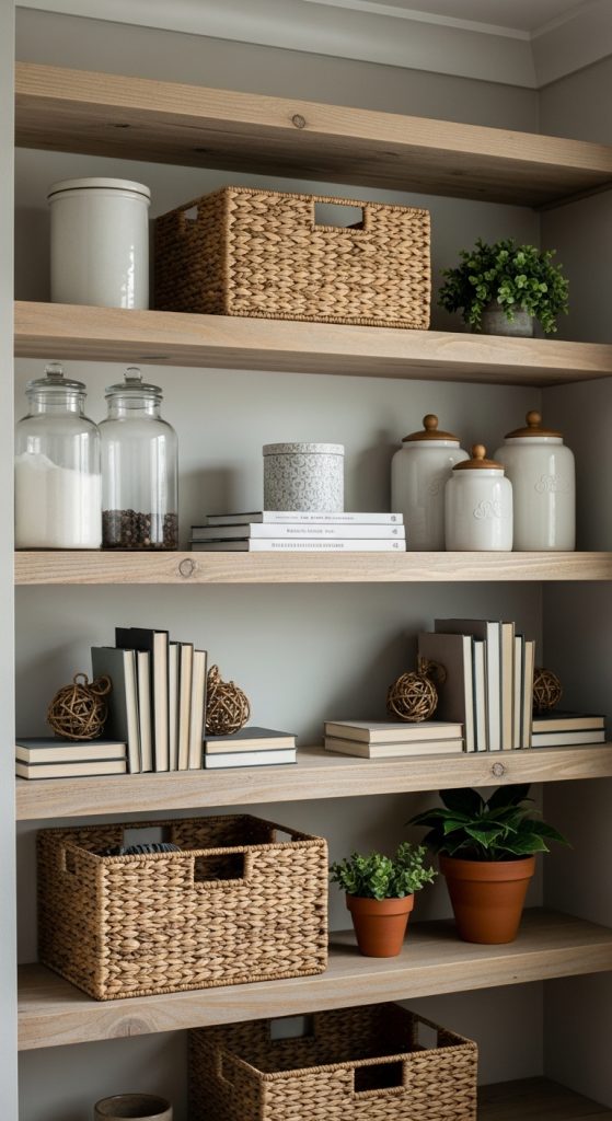 3. Open Shelving With Rustic Baskets
