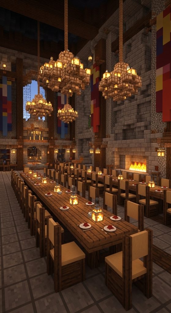 Large towers offer the opportunity for grand dining spaces. Use wooden beams and stone brick walls to create a medieval aesthetic. Place long dining tables with slab chairs and item frames with plates and utensils for decoration. Hanging lanterns or chandeliers add elegance, and a fireplace at the end of the hall adds warmth. This design blends functionality with grandeur, making it perfect for roleplay or showcasing on Pinterest.