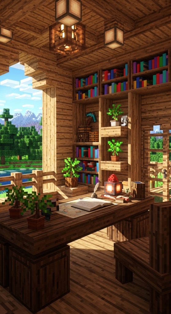 A log cabin study can feel intimate yet inspiring. Use oak or spruce wood planks for flooring and logs for structural accents. Place a large wooden desk with a chair, surrounded by bookshelves and potted plants. Windows with trapdoors or glass panes allow natural light, while a small balcony extends the room outdoors, perfect for viewing scenic landscapes. Lanterns and paintings enhance the cozy, rustic charm, making it an ideal retreat for Minecraft players who love aesthetic builds.