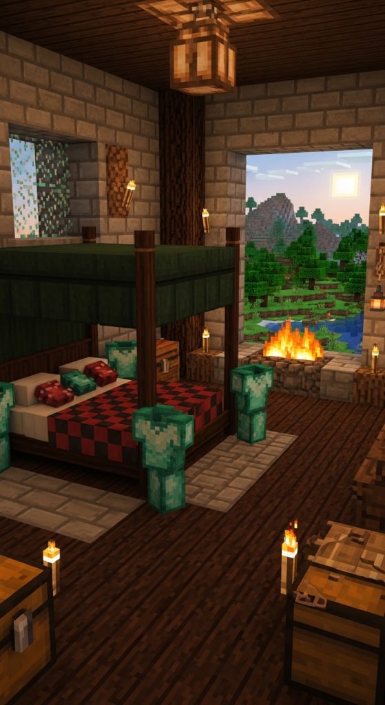 Vertical builds lend themselves perfectly to a dramatic, medieval-style bedroom in a tower. Use dark oak wood floors, stone brick walls, and iron bars or chains for accents. A four-poster bed crafted with wool and wood beams provides a centerpiece, while armor stands with decorative armor add authenticity. Wall torches or lanterns provide soft lighting, and windows with trapdoors or glass panes frame breathtaking views. Add a small reading corner with bookshelves to complete the sophisticated look.