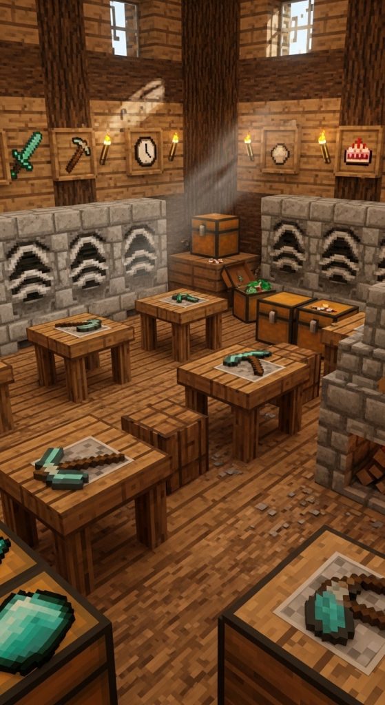 A log cabin can double as a practical crafting hub. Design a spacious crafting room with crafting tables, furnaces, and anvil setups. Use plank flooring and log walls, and consider a stone brick accent wall for a modern rustic touch. Shelves with item frames displaying tools and materials add personality, while lanterns provide ambient lighting. Incorporate a small reading corner or storage chests to keep the space organized and visually appealing.