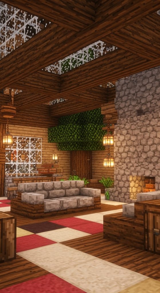 Towers are perfect for lofty, panoramic spaces. A top-floor lounge can be an oasis of calm with glass-pane windows for 360-degree views. Use stone and wood combination for floors and walls, and add cushioned seating areas with slabs and carpets. Include tables with flower pots and a small bar or brewing station for realism. Soft hanging lanterns or glowstone provide warm, ambient lighting, making it ideal for a relaxing retreat high above the Minecraft world.