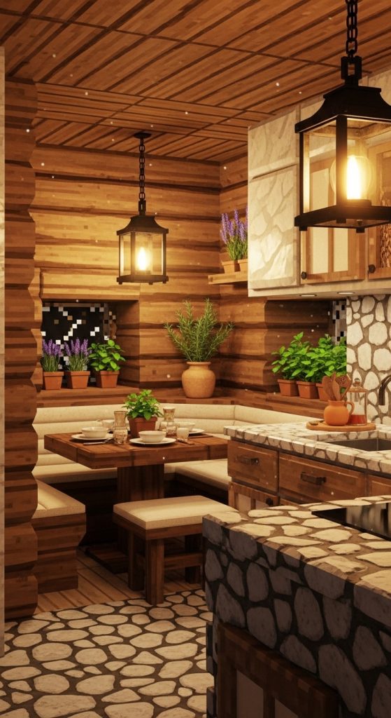 A log cabinโs kitchen can be both functional and visually charming. Use spruce logs and planks for walls and counters, and stone slabs for the countertops. Include a furnace stove setup with a chimney, and a crafting table island in the center for a modern rustic touch. Decorate with item frames for utensils, flower pots with herbs, and glowing lanterns hanging from the ceiling. A small dining nook with wooden chairs and a table made from slabs enhances the cozy feel.