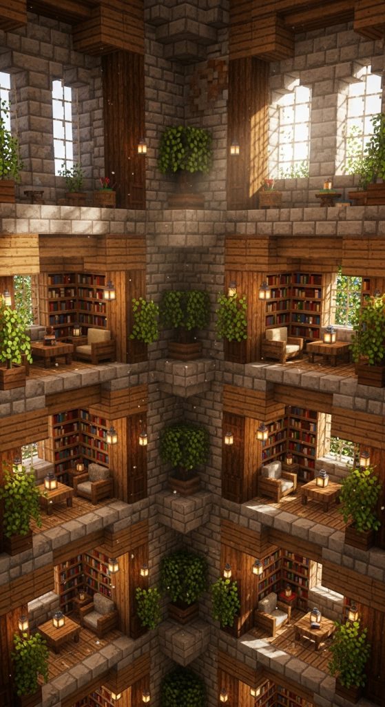 A tower is a perfect structure for a vertical, multi-level library. In Minecraft, using oak or spruce wood planks, combined with stone brick walls, creates a cozy yet medieval feel. Arrange bookshelves along each level, with ladders or spiral staircases connecting floors. Incorporate reading nooks with armchairs crafted from stairs and signs, and place glowing lanterns for warm ambient lighting. Adding flower pots and small potted trees brings life to the vertical space, making it feel less like a fortress and more like a welcoming sanctuary.