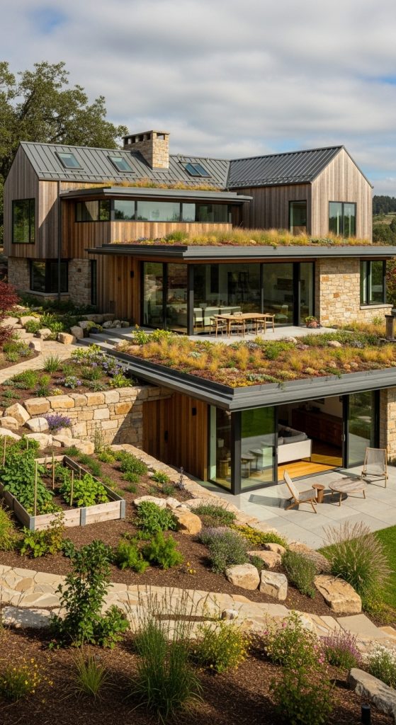 Green roofs on lower sections, rainwater collection systems, and native landscaping help reduce environmental impact while maintaining farmhouse charm. Building with the slope instead of against it reduces soil disruption and preserves the natural ecosystem.