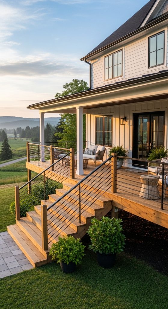 Modern farmhouse porches on slopes often feature clean railings, wooden columns, and metal accents that balance tradition with contemporary style. Wide steps leading up to the porch create a welcoming entrance and emphasize the home’s connection to the terrain.
