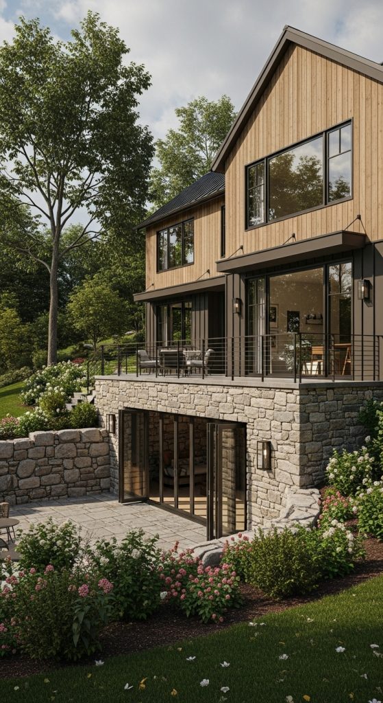 This approach reduces heavy excavation costs while enhancing the farmhouse aesthetic. Wood siding, metal roofing, and stone foundations feel authentic and grounded, making the home look like it has always belonged there.
