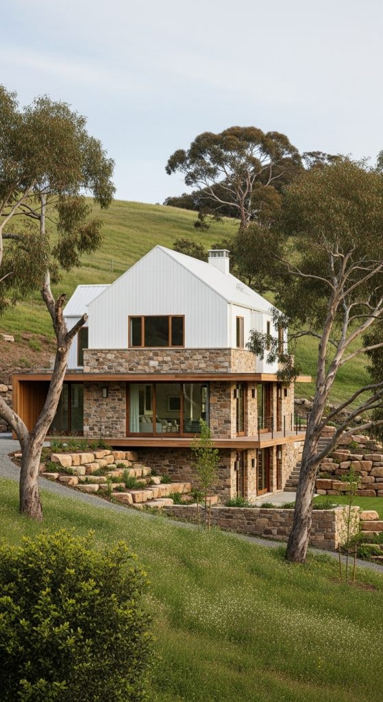 Modern farmhouse style is loved for its warm materials, clean lines, and timeless charm. When paired with a hillside or sloped lot, this style becomes even more captivating. Natural textures like wood, stone, and metal blend seamlessly with the land, while open interiors and large windows invite the outdoors inside. A farmhouse on a slope feels organic, peaceful, and visually striking — the kind of home that looks beautiful from every angle.