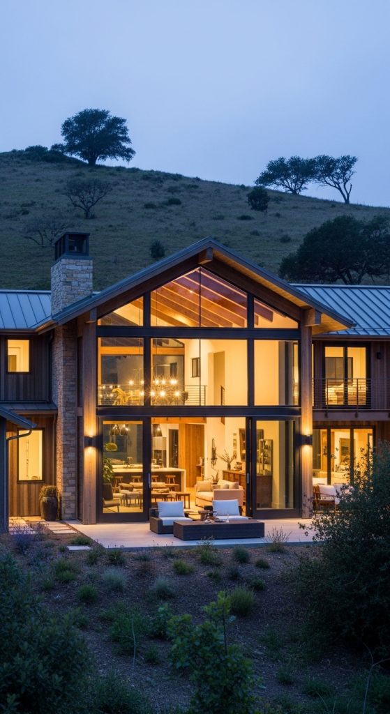 These windows are carefully placed to capture the best angles of the land — whether it’s a valley below, trees climbing upward, or sunlight shifting across the slope. Inside, the farmhouse remains warm and cozy with natural wood beams, neutral palettes, and textured finishes that balance the openness of the glass.