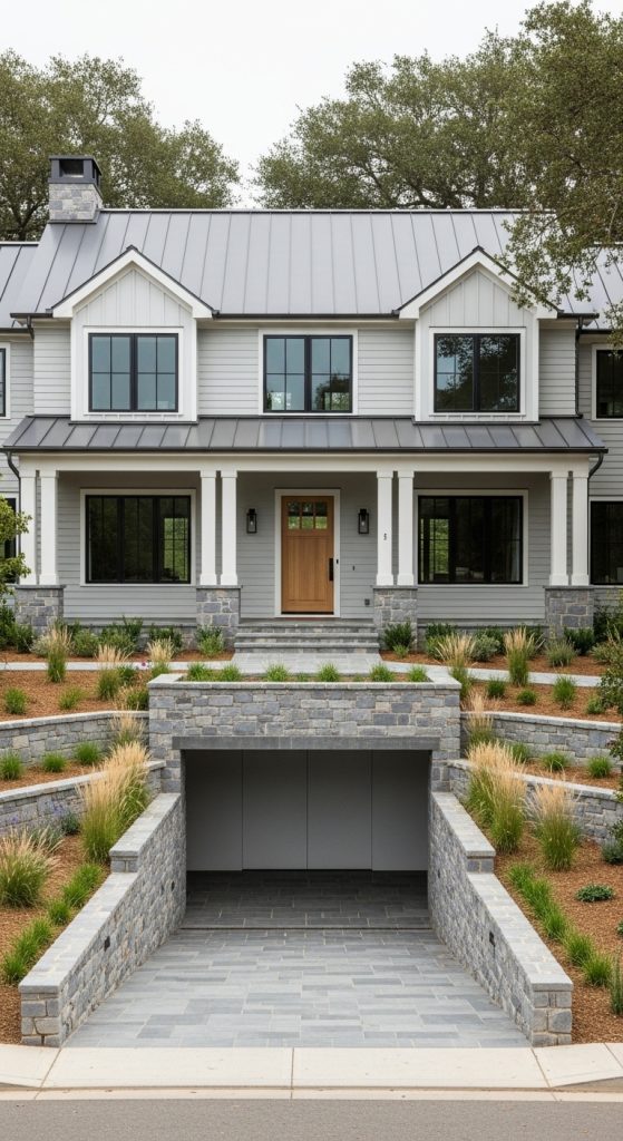 Garages can easily disrupt the charm of a farmhouse, but on a slope, they can be cleverly hidden. Rear-entry or lower-level garages are built into the hillside, keeping the front façade clean and welcoming.