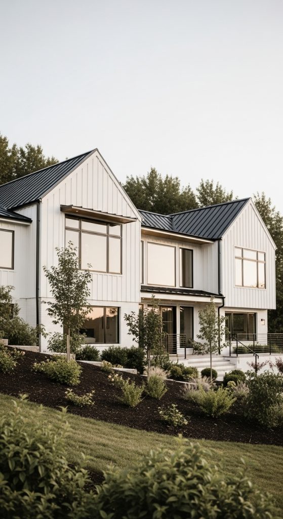 A modern farmhouse on a slope is more than a house — it’s a conversation between architecture and nature. When designed thoughtfully, the slope becomes a defining feature rather than a challenge. From split-level layouts to terraced outdoor spaces and panoramic windows, these homes feel grounded, warm, and visually unforgettable.
