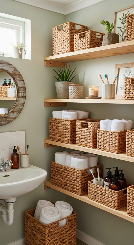 Clutter is a small bathroom’s enemy, but farmhouse style thrives on natural storage solutions. Woven baskets in rattan, wicker, or seagrass keep towels, toiletries, and laundry organized while adding texture.