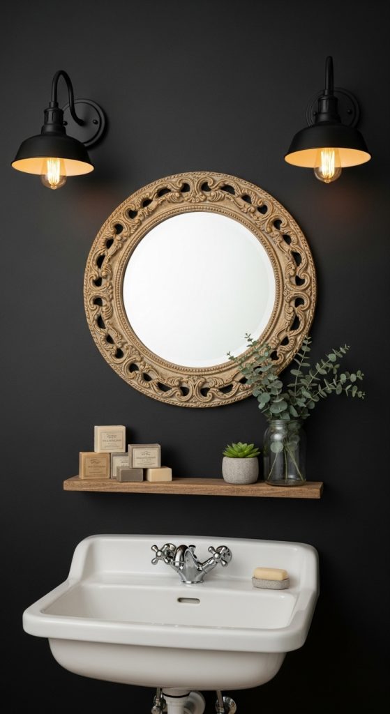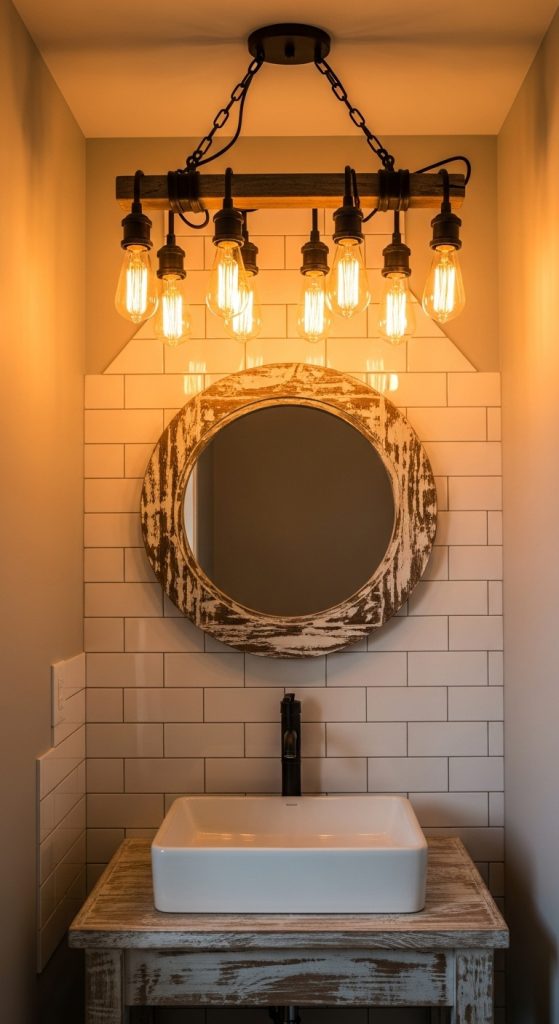 Mirrors are essential in small bathrooms—they create the illusion of space while adding farmhouse style. Round or oval framed mirrors in wood, metal, or rope textures are perfect. Consider a gallery wall of small mirrors to add depth and character.