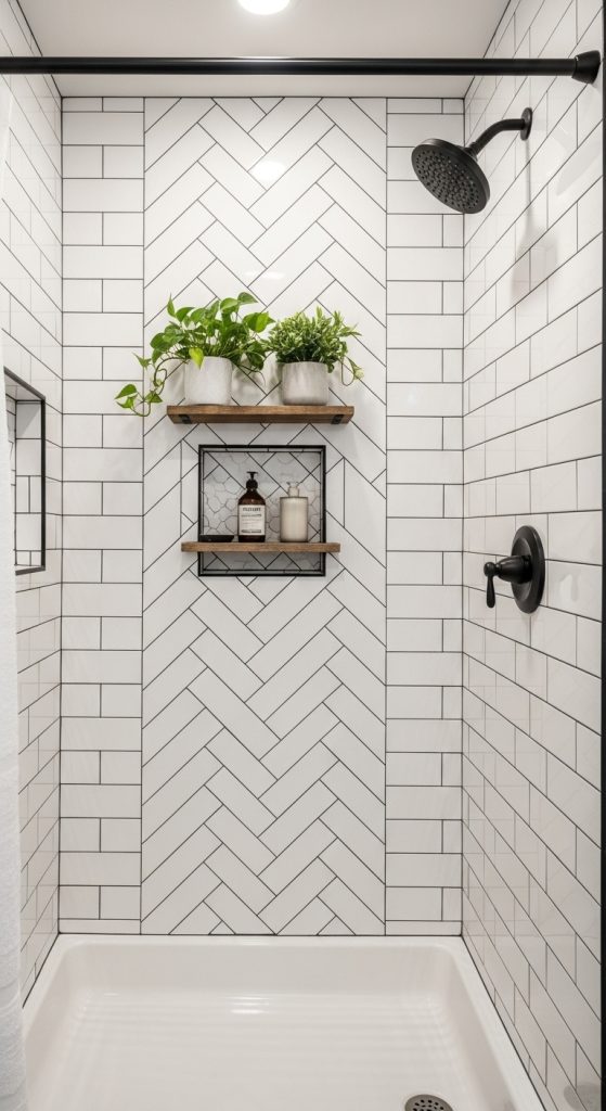 Combine tiles with rustic wooden accents—like a small shelf, mirror frame, or towel rack—to soften the sleek look. This mix of old and new keeps the design modern yet rooted in farmhouse aesthetics.