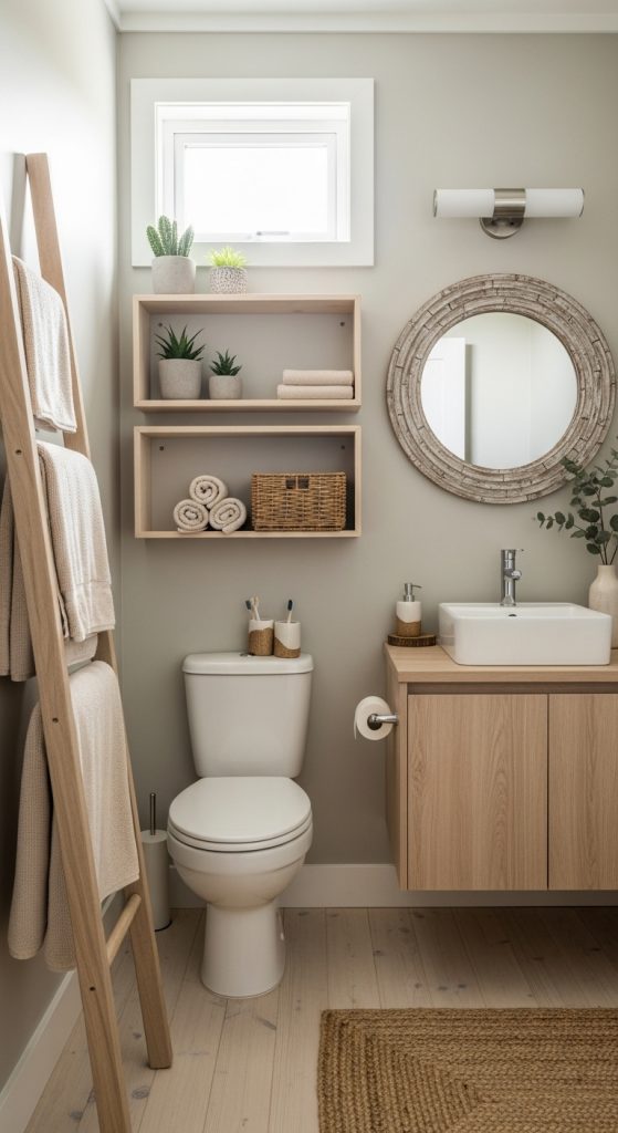 Consider adding a tall wooden ladder for hanging towels or creating a display of rustic décor. Vertical shelving units beside the vanity or above the toilet provide additional storage without cluttering the floor. Vertical planning makes a small space feel organized, airy, and elegant.