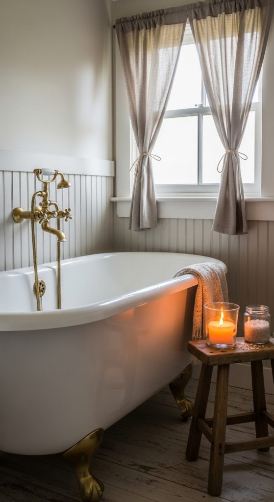 Pair the tub with a simple wall-mounted faucet in brass or matte black. Add a vintage wooden stool or a small side table to hold a candle, book, or bath salts for a spa-like farmhouse experience. Light linen curtains or Roman shades keep the look airy while maintaining privacy.