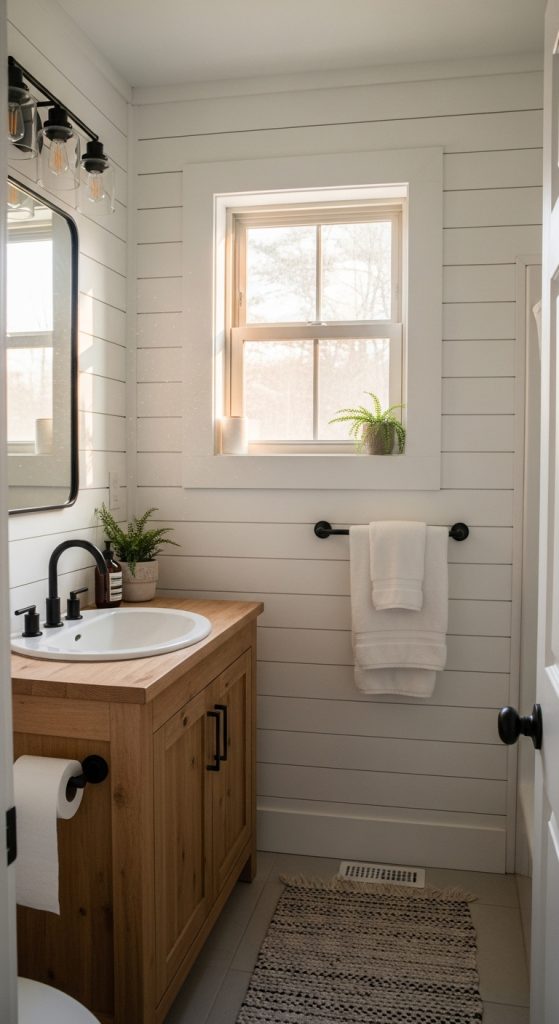To enhance the farmhouse charm, pair shiplap with rustic wooden shelves for storing towels and toiletries. Adding subtle vintage accessories, like a small antique soap dish or metal hooks, completes the cozy look.