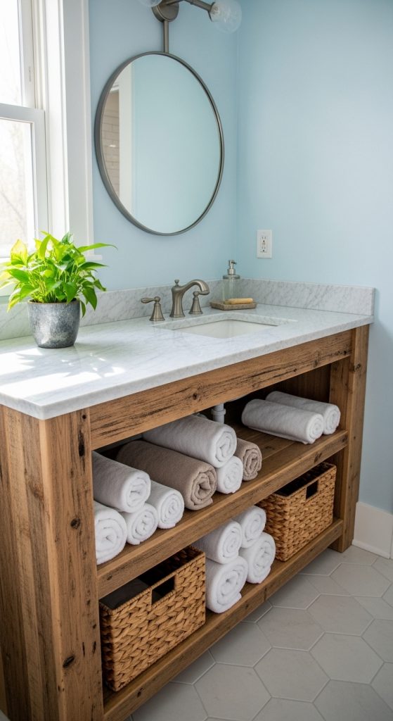 Open shelving is perfect for neatly stacking rolled towels, wicker baskets for essentials, or displaying potted plants. Choose a countertop in marble, butcher block, or concrete for a clean, timeless look. Hardware in black or oil-rubbed bronze complements the rustic style perfectly.