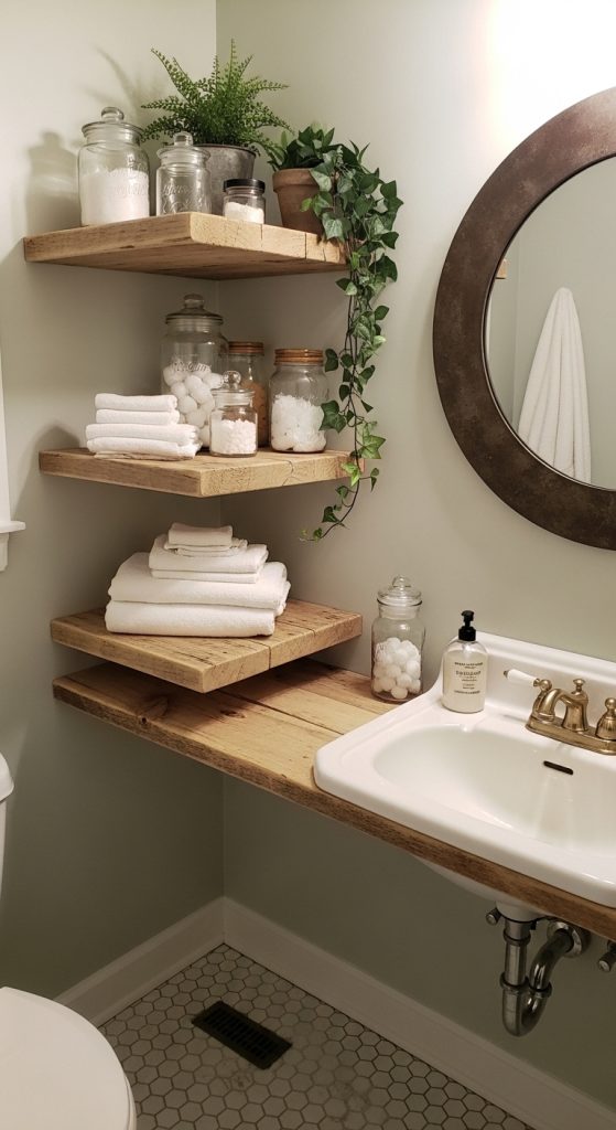 Choose wood finishes that match your vanity or accent with contrasting painted shelves for visual interest. Stack hand towels, vintage soaps, or tiny potted herbs for a charming farmhouse display.