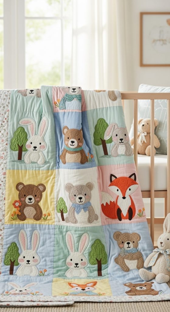 For nurseries inspired by wildlife or farm themes, an animal-themed quilt brings imagination and fun. Each quilt square can feature embroidered or appliqué animals such as bunnies, bears, foxes, or owls. Using a mix of soft textures, like velour or minky fabric for the animals, adds extra tactile interest.