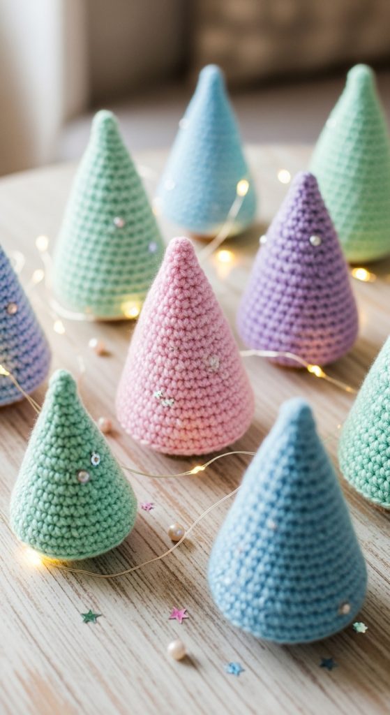 Tiny crochet Christmas trees make perfect table decorations, mantel accents, or stocking stuffers. These trees can be made in a variety of yarn colors to match your holiday décor. Adding a small star or bead at the top creates a whimsical, finished look.