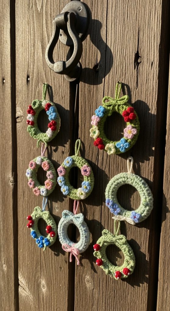 Mini crochet wreaths are versatile and eye-catching. They can be hung on doors, walls, or windows, and are perfect for holidays like Christmas, Easter, or even Halloween.