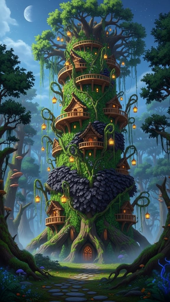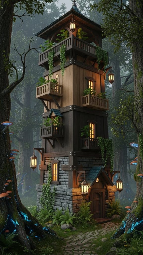 Imagine a tower nestled in the heart of a dense forest, blending seamlessly with nature. The Mystic Forest Tower features a combination of oak and dark oak wood with stone accents, giving it a rustic yet magical feel. Vines drape down the sides, and small balconies with potted plants offer a cozy touch. Incorporate glowing lanterns and emerald detailing to create a subtle enchanted vibe.