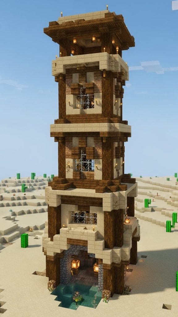 In the harsh desert biome, a Desert Sentinel Tower stands tall with sandstone and smooth sandstone, accented with dark oak beams. Torches and glowstone prevent mobs from spawning nearby, and the top floor can include a lookout with a simple compass-based navigation area.