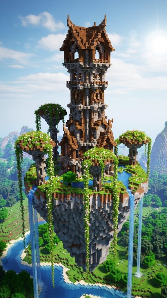 If you’re feeling adventurous, build a tower on a floating island. Cobblestone, stone bricks, and wood create a base for the tower, while the island floats above the landscape using natural block formations. Bridges and ladders connect floating platforms, creating a magical fantasy aesthetic.