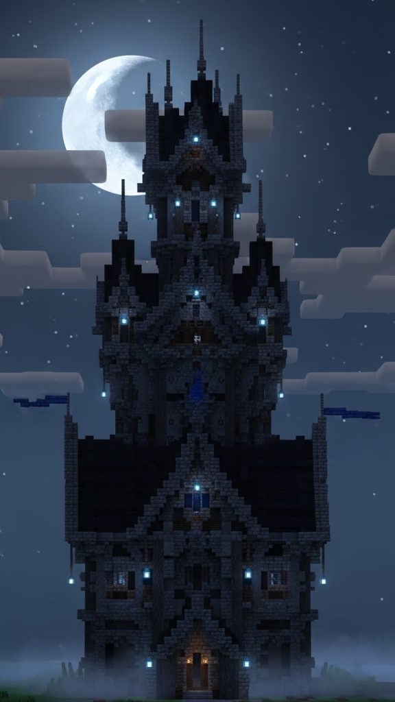 For a darker, more mysterious vibe, the Gothic Night Tower uses blackstone, cobblestone, and dark oak. Tall spires, pointed windows, and intricate roof details create a dramatic silhouette. The interior features an enchanting room, a potion station, and a library with hidden rooms.