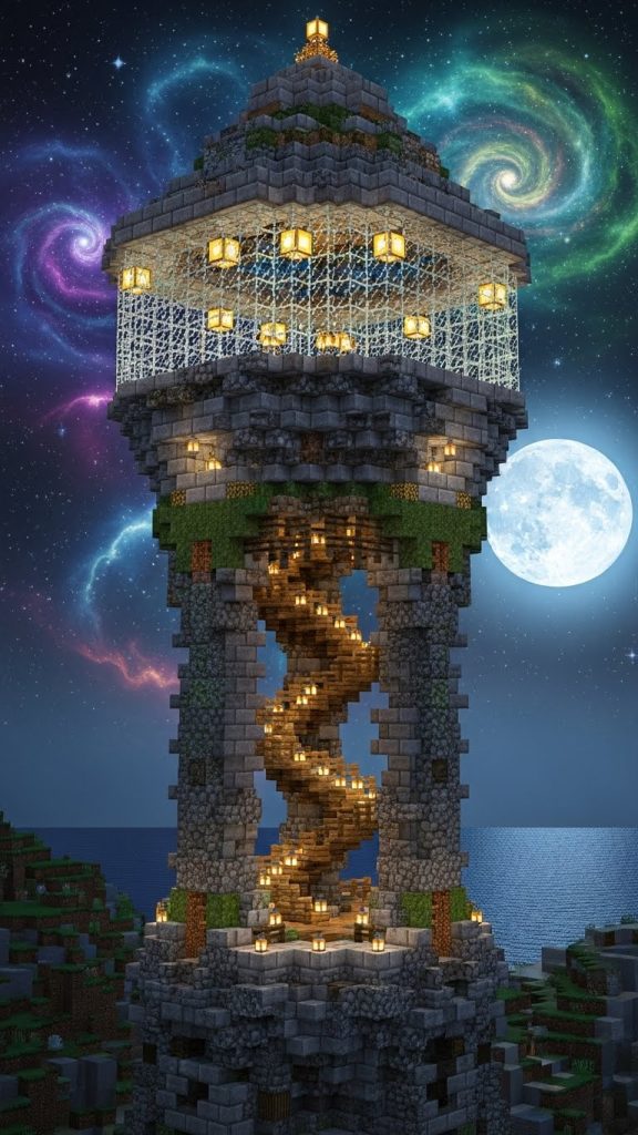 For the adventurer who loves height, the Skywatcher’s Tower is a slim, tall structure made with stone bricks and glass windows. The top level is a panoramic observation deck with a telescope made from fences and end rods. The tower glows with sea lanterns and glowstone, giving it a celestial look at night.