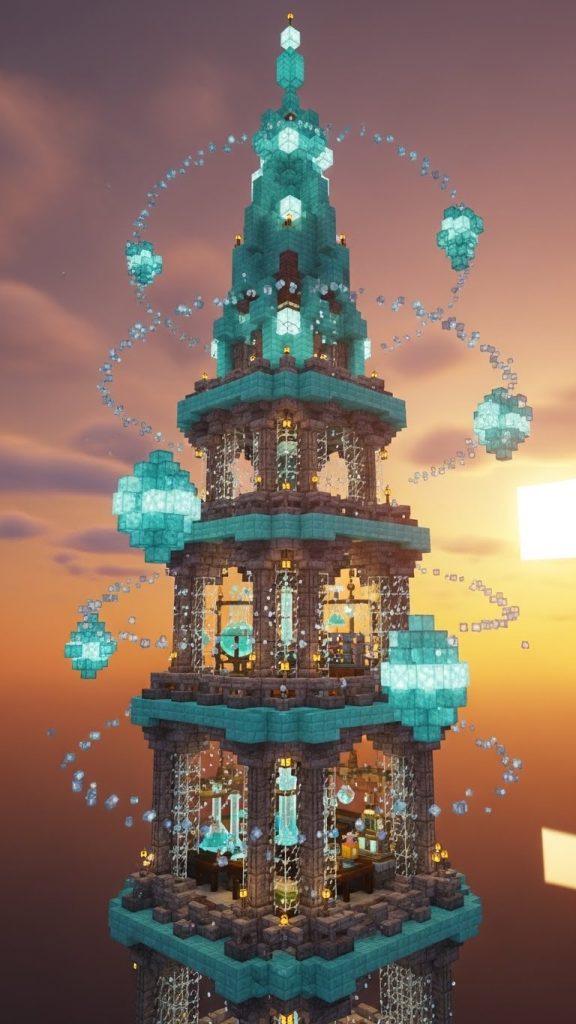 Inspired by fantasy castles, the Crystal Spire Tower uses prismarine and glass blocks to create a shimmering effect. At sunset, the tower looks like it is glowing from within, especially when combined with lanterns or shroomlight accents. The interior features an alchemy lab and enchanting room.
