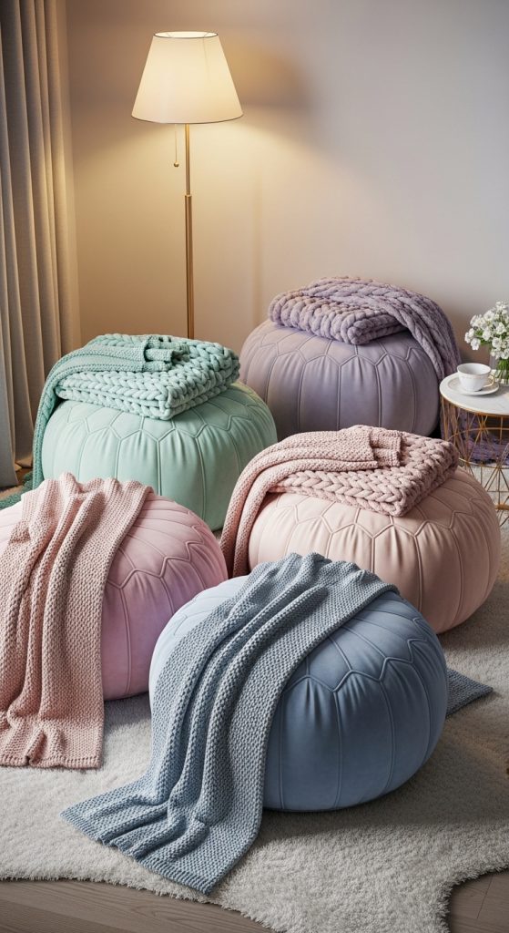 Soft velvet poufs and floor cushions are not just comfortable; they enhance the luxury factor in a room. Create your own using high-quality velvet fabric in pastel shades, stuffed with plush filling. Cluster them in a corner with a faux fur rug to build a chic lounging area perfect for friends or cozy evenings alone.