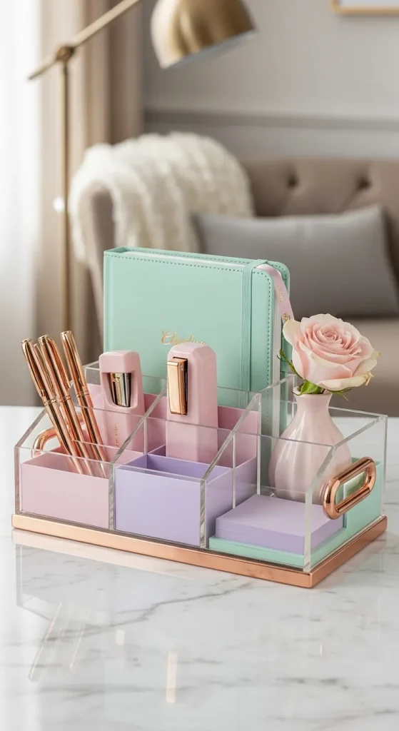 Combine functionality with elegance by creating a DIY acrylic desk organizer. Use clear acrylic boxes and trays, and decorate them with pastel paints or subtle metallic accents. This helps keep your desk clutter-free while adding a touch of sophistication. Perfect for storing stationery, makeup, or small trinkets.