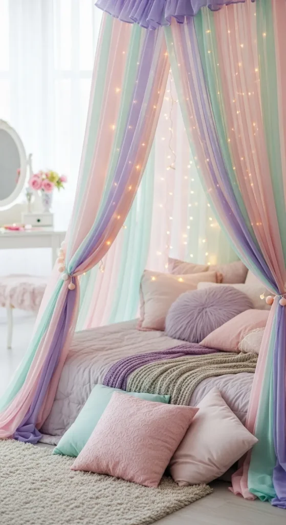 Nothing screams soft girl luxury like a dreamy canopy bed adorned with fairy lights. Use sheer pastel curtains to drape around your bed and string twinkling warm white fairy lights for a whimsical glow. This creates a cozy corner perfect for reading, relaxing, or scrolling Pinterest in ultimate style.