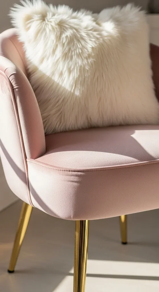 A plush velvet accent chair in blush pink or soft lavender can become the centerpiece of any soft girl room. Enhance its luxury feel with DIY gold or crystal-studded legs. Add a tiny faux fur pillow to match the soft aesthetic. This piece not only offers comfort but adds a chic designer-like touch to the space.