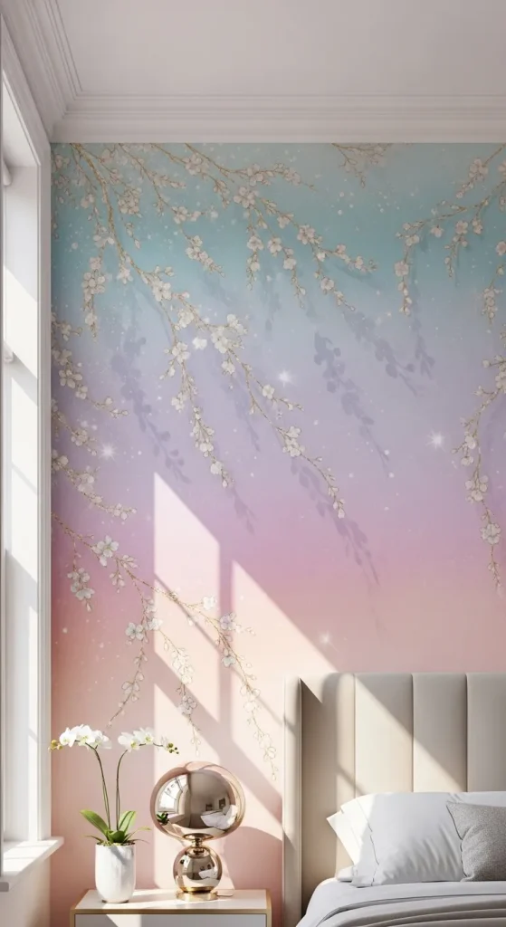 A pastel ombre wall instantly elevates a room’s vibe, making it feel airy and luxurious. Choose soft pinks, lilacs, and creamy whites to create a gradient effect across one wall. For a personal touch, hand-paint small gold accents or delicate floral designs over the ombre to make the space feel customized and upscale.