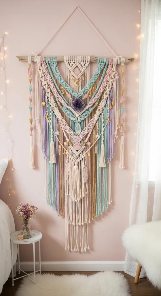 Macramé wall hangings offer both texture and elegance to a room. Use pastel yarns mixed with metallic threads to craft your own luxurious piece. Add small charms or crystals within the knots for a magical, soft girl touch. It’s perfect for filling empty walls and bringing a cozy, handmade feel to your space.
