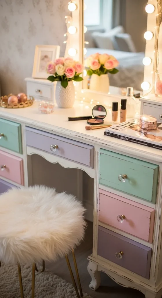 A vanity table is the ultimate soft girl luxury statement piece. Use a simple wooden table and transform it with pastel paint, mirrored panels, or DIY crystal knobs. Add a small faux fur stool and delicate lighting to create a vanity that’s both functional and picture-perfect for your Pinterest feed.