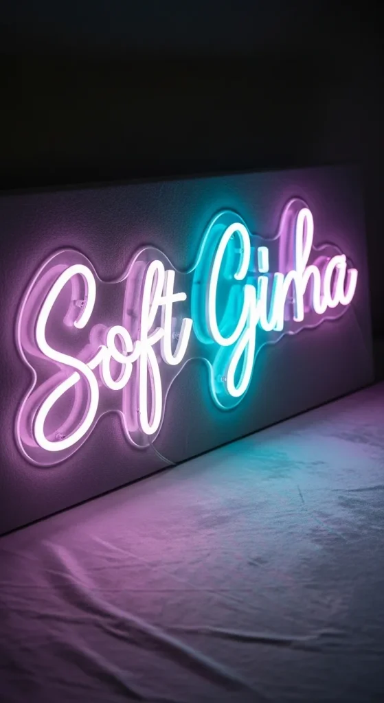 Nothing feels more luxurious than a custom neon sign in your favorite pastel color. Use DIY neon kits or flexible LED neon strips to craft phrases like “Stay Soft” or “Dream Big.” Mount it on a velvet or pastel-colored board for added sophistication. This adds a personalized and vibrant glow to your room instantly.