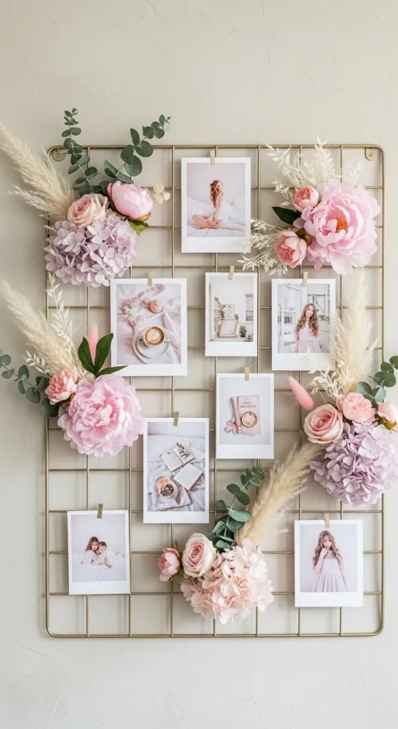 A floral wall grid is an elegant and creative way to showcase your favorite decor items. Use a gold metal grid frame and attach small pastel vases, photos, or dried flowers using mini clips. This DIY project adds a feminine touch to your walls and serves as a rotating display of beauty and inspiration.