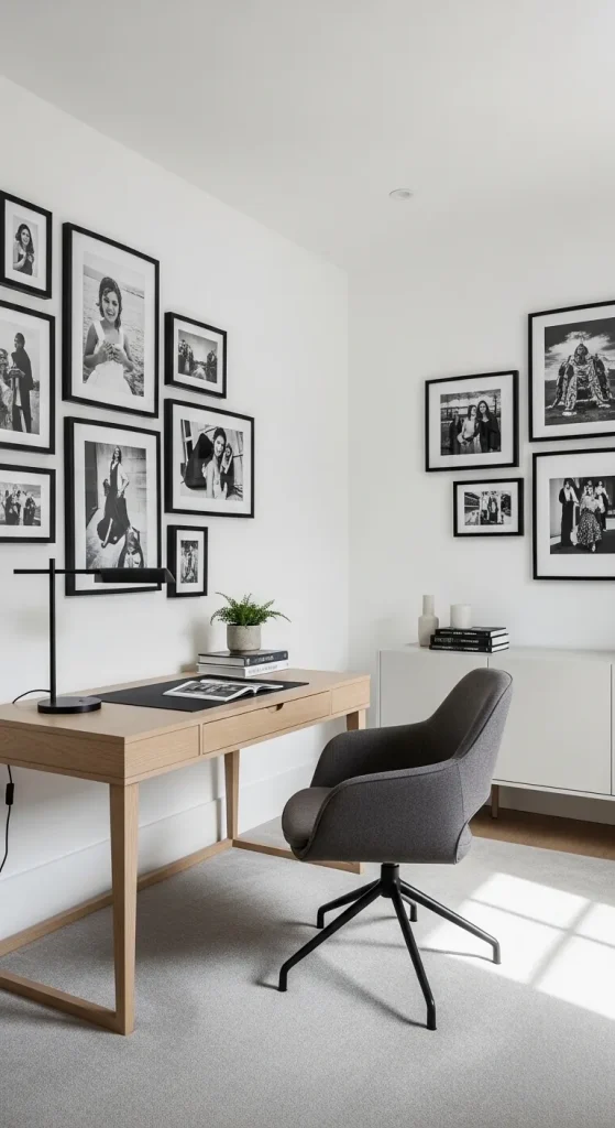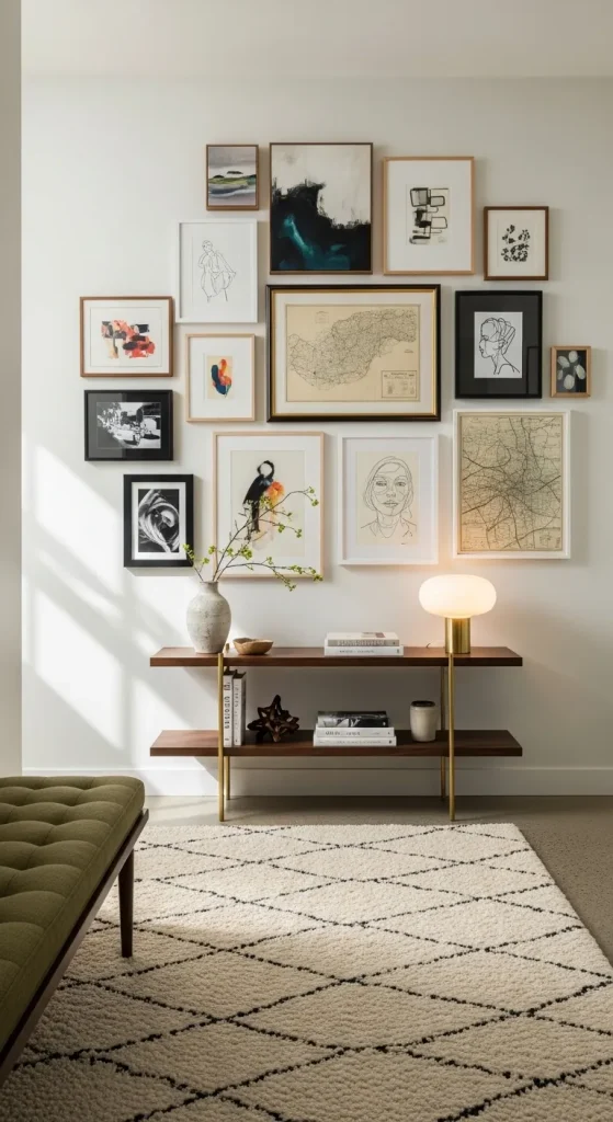 A gallery wall is perfect for showcasing a curated mix of prints, photos, and small paintings. Experiment with different frame textures, sizes, and orientations to create a dynamic visual experience. This idea works particularly well in living rooms, home offices, or entryways where you want to express your personality boldly.