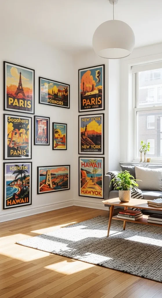 Inject a sense of wanderlust into your apartment with vintage travel posters. From 1920s Parisian advertisements to retro tropical escapes, these pieces bring color, history, and personality to your walls. Framed in sleek black or warm wooden frames, they become a conversation starter and a reminder of adventures past or future.